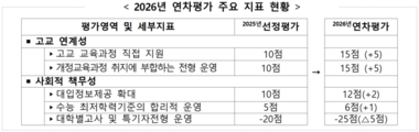 교육부는 24일 ‘2026년 고교교육 기여대학 지원사업 기본계획’을 발표하고 작년에 선정한 전국 92개교에 총 575억 원을 추가로 지원한다고 혔다. 2014년부터 시작된 이 사업은 올해 4주기(2025~2026년)의 2차 연도에 해당된다. 이에 작년에 선정된 곳들의 사업 현황 점검, 성과 확산이 올해 목표다. 올해는 대학들이 고교학점제 시행, 2028 대입개편안 도입 등 대입 환경 변화에 안정적으로 대응할 수 있도록 연차평가를 통해 작년 사업의 성과와 향후 계획을 점검하게 된다. 교육부에 따르면 연차평가의 지표 배점 설정은 2022 개정 교육과정과 2028 대입개편안 취지를 반영해 새로운 입학전형을 구체적으로 설계해야 하는 시기를 고려했다. 대학의 역할 수행과 입학전형 개선이 공교육 안정화, 사교육 부담 완화 등 사업 목적에 부합하는 방향으로 이뤄지도록 한다는 것이다. 교육부는 1차 연도 사업 추진을 통해서는 고교생을 위한 선택과목과 전공·진로 체험활동 개설, 1대1상담(멘토링)과 대입전형 안내·상담 운영 등 학생·학부모에게 총 445개의 프로그램을 제공했다. 사교육 유발 가능성이 높은 논술·특기자 전형보다 학생부·수능 위주 전형 중심 운영도 지원했다. 사업 참여 대학들의 입학전형 개선 연구 결과는 다른 대학들이 2028학년도 입학전형 준비에 참고할 수 있도록 해당 대학의 홈페이지와 ‘한국대학교육협의회 홈페이지’(https://www.kcue.or.kr)에 공개된다. ▲입학사정관 교육·훈련 ▲교육과정 직접 지원 ▲전형 운영 개선(2022 개정 교육과정 연계성 제고 등) ▲대입정보 제공 확대 등 4가지 분야 자율공모 사업 대상 16개교도 당초 수립한 사업계획의 이행 노력, 1차 연도 성과지표 달성도 등을 평가한다. 이와 관련한 성과 공유회 개최 등 다양한 선도모형의 발굴·확산도 진행될 전망이다. 이해숙 고등평생정책실장은 “올해는 대학별로 고교의 새로운 평가 체제를 반영한 ‘2028학년도 대입전형시행계획’을 발표하는 해”라며 “고교교육 기여대학 지원사업을 통해 학생들이 공교육으로도 충분히 준비할 수 있는 방향으로 대입전형이 마련되도록 지원해 나갈 것”이라고 말했다.