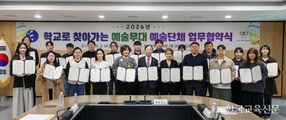 대전교육청이 지역 예술단체와 함께 학생들의 문화예술 향유 기회 확대에 나선다. 교육청은 24일 20개 지역 예술단체와 ‘2026년 학교로 찾아가는 예술무대’ 추진을 위한 업무협약(사진)을 체결하고 내실 있는 학교예술교육 지원을 약속했다. 이번 사업은 2015년 ‘찾아가는 음악회’로 시작해 미술과 무용, 연극 등으로 분야를 넓혀온 대전교육청의 대표적인 예술교육 프로그램이다. 지난해까지 총 636교에서 공연을 진행하며 학생들에게 다채로운 문화 체험의 장을 제공해 왔다. 올해는 초·중·고 120교를 대상으로 2억1600만 원의 예산을 투입해 운영한다. 오페라와 퓨전국악, 뮤지컬 등 장르를 다양화하는 것은 물론, 예술가와 학생이 직접 소통하는 참여형 프로그램을 강화해 관람 위주의 공연에서 벗어난 입체적인 예술 체험을 지원할 방침이다. 지은주 대전오페라단 대표는 “학생들과 가까이서 호흡하며 공연할 수 있게 돼 뜻깊다”며 “예술을 통해 풍부한 감성을 키울 수 있도록 최선을 다하겠다”라고 말했다. 설동호 대전교육감은 “지역 사회와 힘을 모아 학교예술교육 활성화를 도모하는 것이 무엇보다 중요하다”며 “예술단체와의 상생 협력을 바탕으로 현장의 예술교육이 안정적으로 운영될 수 있도록 적극 지원하겠다”라고 밝혔다.