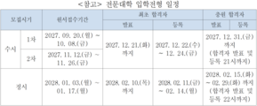 한국전문대학교육협의회(전문대교협)는 현재 고1 학생이 치르는 2028학년도 입학 전형부터 수시모집 시작 일정을 9월 20일로 미루는 내용 등을 담은 ‘2028학년도 전문대학 입학전형 기본사항’을 발표했다. 이는 2028학년도부터 대학수학능력시험(수능) 하반기 모의평가(모평) 시행일이 9월에서 8월로 옮겨지는 것에 대한 일정 조정이다. 1주일 정도 앞당겨진 모평 일정으로 수시 일정을 조금만 늦추면 성적 통보까지 기다릴 수 있는 여유가 생겼다. 모평 시행일부터 성적 통보까지는 2주 정도가 소요된다. 현재는 수능 하반기 모평 성적 통보가 되지 않는 상황에서 수시모집을 진행하고 있다. 한국대학교육협의회(대교협)에 이어 전문대교협도 수시모집 시작일을 이동하면서 대학 입시 일정 조정이 완료됐다. 얼마 전 대교협도 수시모집 시작일을 하반기 수능 모평 성적 통보 이후인 9월 20일로 정한 바 있다. 앞서 교육부는 2028학년도 하반기 수능 모평 일정 변경안을 발표하고 2027년부터 하반기 모평을 8월 넷째 주 또는 다섯째 주에 시행하기로 했다. 마지막 모평 성적 통지 전 수시모집에 지원해야 하는 현재 상황에서 큰 불확실성 때문에 고액 사교육 컨설팅 등에 의존할 수밖에 없다는 지적이 줄곧 제기돼 오자 시정한 것이다. 이번 기본사항 발표에는 ‘고른기회(지역인재) 특별전형 지원 자격 명확화’도 포함됐다. 전문대교협은 ‘지방대학 및 지역균형인재 육성에 관한 법률’을 반영해 2028학년도부터는 간호학과에서 의무적으로 일정비율 이상 지역인재를 선발할 때 2022년 중학교 입학자부터는 수도권이 아닌 지역의 중학교와 해당 대학 소재 지역의 고교에서 모든 교육과정을 이수하고, 재학 기간 내내 해당 지역에 거주해야 하는 지원 자격을 안내했다. 또한 농어촌학생 특별전형과 관련해 재학 및 거주 기간의 기준이 되는 ‘입학일’과 ‘졸업일’을 지원자 학교생활기록부에 기재된 날짜로 한다. 재외국민 및 외국인 특별전형의 세부 자격 기준도 재정리한다. 수시모집은 2회(차)까지 운영하고 정시모집의 경우는 1차례만 진행하는 것은 종전과 동일하다. 원서 접수 일정도 학생·학부모가 쉽게 기억하고 충분히 진로·진학 계획을 세울 수 있도록 전국 모든 전문대학이 동일하게 운영한다. 미등록 충원 합격자 발표 및 등록마감은 '대입지원방법 위반 사전예방 시스템' 마감시간을 고려해 수시는 21시, 정시는 22시까지로 정했다. 학생·학부모 및 교사 등이 전문대학 입학전형 내용을 보다 쉽게 이해하고 입시를 준비할 수 있도록 입학 전형방법 간소화 및 ‘특별전형’명칭 표준화를 계속 유지하기로 했다. 학생 선발 시 핵심 전형요소 5개(학생부·수능·면접·실기·서류) 중에서 전형요소 간 반영 비율을 결합해 수시 4개, 정시 4개 이내로 전형방법 수를 제한한다. 정원 내 특별전형은 총괄적인 특징과 지원 자격 등을 충분히 대표할 수 있는 7가지 용어(일반고·특성화고·협약을 통한 연계교육·고른 기회·특기자·추천자·대학자체)로 전형명칭을 표준화해 학생·학부모·교사들이 전형유형을 명확히 파악할 수 있도록 했다. 전문대교협은 이번 발표 사항 등을 전문대학 포털-프로칼리지(www.procollege.kr)와 홈페이지(www.kcce.or.kr)에 게재할 예정이다.