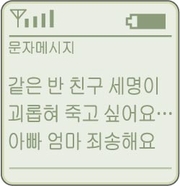 같은 반 학생들로부터 괴롭힘을 당하던 한 중학생이 휴대전화에 '문자 유서'를 남겨놓고 스스로 목숨을 끊었다. 지난달 30일 오후 8시께 경기도 화성시 장안면 김모(42)씨 집에서 김씨의 아들(16.중3)이 차고 천장에 목을 매 숨져 있는 것을 김씨가 발견해 경찰에 신고했다. 김씨는 평소 체격도 좋고 활달한 성격의 큰 아들이 자살한 이유를 이해할 수 없었고 경찰조사에서도 "죽은 이유를 도저히 모르겠다"고 진술했다. 그러나 경찰서에서 돌아와 아들 방을 뒤지던 김씨는 잠금 설정이 된 휴대전화 문자메시지 보관함에서 숨진 김군이 부모에게 남긴 문자 유서를 발견했다. '엄마 아빠 보세요'라는 말로 시작된 유서에는 '같은 반 ○○○, ○○○, ○○○가 못살게 굴어 죽고 싶다. 아빠 엄마 죄송합니다'는 내용이 담겨 있었다. 김씨는 "아들이 중학교 1학년이던 2003년 수원에서 살다 전학을 왔는데 주변 아이들이 텃세를 부리면서 폭력을 행사한 것 같다"며 가해 학생들의 처벌을 강력히 요구했다. 한편 애초 단순 자살사건으로 판단했던 경찰은 유족들을 다시 방문해 정확한 사고경위를 조사한 후 가해학생 입건여부 등을 결정할 예정이다.