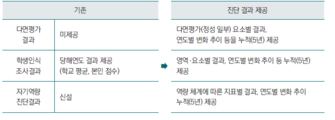우리나라의 교원평가제도는 목적에 따라서 근무성적평정(1964~), 성과상여금평가(2001~), 교원능력개발평가(2005~) 등 3가지 유형으로 구분할 수 있습니다. 지난 2015년 교원평가 전면 개편에 따라 중복된 평가를 통합하고 단순화하여 교원업적평가와 교원능력개발평가의 이원화 체제로 운영되고 있습니다. 2023년 교육현장의 다양한 요구에 따라 2023년부터 현재까지 교원능력개발평가가 교원전문성 신장에 실효성이 있는지에 대한 문제 제기에 따라 평가를 유보하고 제도개선을 위한 방안을 마련 중입니다. 이에 따라 이번 호에서는 2026학년도 시행 예정인 교원역량개발지원제도에 대해 살펴보고자 합니다. 1. 근거 가. 「헌법」 제31조 ④ 교육의 자주성·전문성·정치적 중립성 및 대학의 자율성은 법률이 정하는 바에 의하여 보장된다. 나. 「교육기본법」 제14조(교원) ① 학교교육에서 교원의 전문성은 존중되며, 교원의 경제적·사회적 지위는 우대되고 그 신분은 보장된다. ② 교원은 교육자로서 갖추어야 할 품성과 자질을 향상시키기 위하여 노력하여야 한다. 2. 개요 가. 우리나라 교원평가제도는 목적에 따라 근무성적평가(1964~), 성과상여금평가(2001~), 교원능력개발평가(2005~) 등 3가지 유형으로 구분 나. 2015년 교원평가 전면 개편을 통해서 중복된 평가를 통합·단순화하여 교원업적평가와 교원능력개발평가의 이원화 체제로 운영 중 3. 교원평가 운영 현황 가. 교원업적평가 1) 개요: 성과평가로서 근무성적평정과 성과상여금평가로 구성되며, 학교관리자 평가와 다면평가 합산 방식 2) 근거: 「교육공무원법」, 「교육공무원 승진규정」, 「공무원수당에 관한 규정」 등 3) 활용: 승진 인사를 위한 기초자료로 활용(근평 60% + 다면평가 40%), 다면평가 결과는 성과상여금 지급액 산출 근거로 활용 [PART VIEW] 나. 교원능력개발평가 1) 개요: 전문성평가로서 체크리스트(5점 척도) 및 서술형 평가로 실시, 동료교원평가와 학생·학부모 만족도 조사 방식 2) 근거: 「교육공무원법」, 「교원 등의 연수에 관한 규정」, 「교원능력개발평가실시훈령」 등 3) 활용: [우수]학습연구년, [일반]직무연수, [미흡]능력향상연수 등 교원의 역량개발을 위한 연수 기회 제공 4. 교원평가 운영진단 가. 평가부담 _ 중복평가 등에 따른 현장의 부담 발생 1) 중복평가: 교원능력개발평가의 동료교원평가와 교원업적평가의 다면평가(정성평가)가 평가지표 등이 유사하여 중복평가 지적 2) 평가 부담: 교원능력개발평가와 교원업적평가의 평가 기간, 관련 위원회 등이 달라 학교업무 부담 증가 나. 평가 신뢰도 _ 평가 결과의 비일관성, 형식적·온정적 평가 경향 1) 비일관성: 역량을 평가하는 유사한 평가에서 개별 교원에 대한 평가 결과가 다른 경우(격차 발생 등)가 있어 평가에 대한 신뢰 저하 ※ 교원능력개발평가가 상위인 교원이 근무성적평정은 하위 결과 발생 2) 관대화 경향: 교원업적평가의 다면평가는 상대평가로 순위 산정에 치중되어 평가 요소별 점수가 왜곡되기 쉽고, 동료교원평가는 절대평가로 온정주의적 평가로 관대화 경향이 높음 3) 자기효능감 저해: 학생 만족도 조사가 교원을 평가 대상화하여 자기효능감을 저해하고, 역량진단에 한계 4) 제한된 정보: 학부모가 교원능력개발평가에 참여하나 제한된 정보를 통한 평가로 객관성이 담보되지 않은 부실 평가 우려 5) 유치원 특성 고려 부족: 일부 병설유치원에서 소속 초등학교 교원과 통합하여 다면평가를 실시하는 등 유치원의 특성 고려 부족 다. 평가 내용 _ 현장 교원에게 필요한 역량과 평가지표 간 불일치 1) 직무 중심: 디지털 대전환, 저출생 등 시대 변화에 따라 학교에 필요한 교원의 역량을 충분히 반영하지 못한 직무 중심 평가 실시 2) 획일적 지표: 공통 평가지표를 통한 평가로 교과·경력 등에 따른 교원의 다양한 역할과 전문성에 맞춤형 역량 진단 및 분석 곤란 라. 평가 인식도 _ 교육3주체(교원·학생·학부모) 인식도 저조 1) 관심도 격차: 교원평가결과에 대한 체계적 피드백이 적어 승진 대상 교원과 다수의 일반교원 간 인식도 및 관심도 격차 발생 2) 인식도 악화: 교원능력개발평가의 학생·학부모 참여율 지속 하락, 서술형 평가에서 발생한 교권 침해 사례로 부정적 인식 확산 마. 결과 활용 _ 노력하는 교원에 대한 혜택 부족 1) 소수 혜택: 교원능력개발평가 결과는 학습연구년제 선발 등에 활용되고 있으나 소수 교원에게만 적용 2) 주도성 저해: 교원을 평가 대상화하여 결과에 따른 능력향상연수를 제공(의무화)하는 것이 자기주도적 성장을 저해한다는 비판 존재 - 교원이 「헌법」과 법률로 보장된 바에 따라 스스로 전문성 개발을 위해 노력할 수 있도록 ‘모든 교원’을 위한 ‘질 높은 연수’로 초점 전환 요구 5 교원평가 개편 방향 가. 개편 중점 교원이 교육전문가로 존중·대우 받고, 자기주도적인 역량 개발을 할 수 있도록 교원능력개발평가를 폐지하고, ‘교원역량개발지원 제도’로 개편 나. 개편 체계 현장부담 완화, 신뢰도, 타당도 제고, 자기주도적 성장 지원, 노력하는 교원 우대 6. 교원역량개발지원 제도 가. 개요 •다양한 진단 방식(동료교원+학생