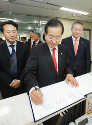 6일 오후 '한나라당-한국교총 정책협의회' 참석을 위해 교총을 방문한 한나라당 홍준표 대표(가운데)가 방명록을 적고 있다. 한나라당 홍준표 대표(좌)와 한국교총 안양옥 회장(우)이 본격적인 정책협의에 앞서 악수를하고 있다. 이날 서울시장 보궐선거에 출마를 선언하고 첫 방문지인 한국교총에 방문한 나경원 시장후보가 환하게 웃으며발언을 하고있다.