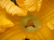장마비 틈 볕에 암 호박꽃이 피었습니다. 꿀벌 두 마리가 일에 정신이 없습니니다. 호박이 열리게 해 주고 꽃가루를 가져 갑니다.