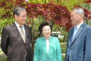 창간 50주년 기념 좌담을 마친 후 안양옥(오른쪽) 한국교총 회장의 안내로 이돈희(왼쪽) 전 교육부 장관과 이배용(가운데) 국가브랜드위원회 위원장이 교총의 앞뜰을 거닐며 교육본질에 대해 정담을 나누고 있다.