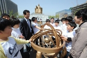 어린이날을 기념해 이주호 교과부 장관의 초청으로 2박 3일간 서울나들이에 나선 인천 연평초 4~6학션 학생 36명이 3일 광화문광장에서 혼천의를 관찰하며 즐거운 시간을 보내고 있다. 학생들은 이날 청와대와 국립과천과학관을 둘러보고 세종문화회관에서 어린이뮤지컬 '알라딘'도 관람했다.