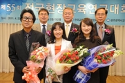 제55회 전국현장교육연구대회 시상식이 지난달 23일 교총회관에서 열렸다. 왼쪽부터 시계 반대 방향으로 정상채 경기 사우고 교사(대통령상), 김영희 포항제철서초 교사(국무총리상), 박성은 송정동초 교사(교과부 장관상 대표 수상), 이규석 교과부 학교교육지원본부장, 안양옥 교총회장, 조용환 심사위원장.