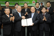 한국교총(회장 안양옥)과 전쟁기념사업회(회장 박장규)는 8일 전쟁기념관에서 호국안보의식 고취 및 나라사랑 정신고양을 위한 업무협약을 체결했다. 안양옥 교총 회장이 박장규 전쟁기념사업회 회장으로부터 기념품을 받고 있다.