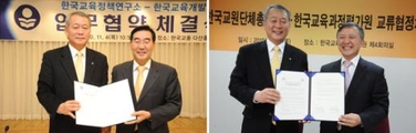 인적교류‧학술 세미나 공동 개최 추진 한국교총(회장 안양옥)은 한국교육개발원(KEDI 원장 김태완), 한국교육과정평가원(KICE 원장 김성열)과 연구 및 세미나, 정책포럼, 심포지엄 등 각종 학술대회를 공동 개최하기로 합의했다. 교총은 두 기관과 각각 4, 11일 전략적 협약(MOU)을 체결하고 ▲공개 가능한 교원 관련 데이터 및 연구 결과물 공유 ▲ 세미나, 워크숍, 포럼, 심포지엄 등 학술대회 공동 개최 ▲인적 교류 및 상대기관에 대한 자문(KEDI) ▲ 공동 연구 및 세미나, 정책포럼, 심포지엄 등 각종 학술회의 공동 개최 ▲ 각종 연구․개발 관련 지식·정보·인프라의 공동 활용 및 연구결과물 공유 ▲인적 교류 및 상대기관에 대한 자문(KICE) 등에서 공동 협력키로 했다. 김태완 한국교육개발원 원장은 “KEDI와 교총의 한국교육정책연구소가 같이 할 수 있는 연구가 많을 것”이라며 “특히 교원정책 분야에서 양 기관이 적극적으로 협력해 나갔으면 한다”고 말했다. 김성열 한국교육과정평가원장도 “교총의 우수한 인력과 그간 쌓아온 연구대회 자료 공유를 통해 더욱 업그레이드된 교육과정 연구가 이루어 질 것”이라며 “인력풀 교류를 통해 서로 의견을 많이 듣고 대화하길 바란다”고 강조했다. 안양옥 교총 회장은 “정책선도를 통한 전문직연구단체로의 변화를 꿈꾸고 있다”며 “평가원, 개발원과 협력해 교총이 함께 연구하면 틀림없이 시너지효과를 이룰 아이디어가 나올 것으로 확신한다”고 MOU에 의미를 부여했다.