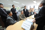 전국국공립대학교수협의회 박병덕 상임회장(오른쪽)을 비롯한 각 대학 교수협의회 회장들이25일 행안부 김진수 성과급여기획과장(뒷줄 왼쪽 세번째)을 방문해 국립대 교원의 성과연봉제 도입 입법예고에 대한 반대 서명 용지를 전달하며 즉각 철회할 것을 촉구하고 있다.