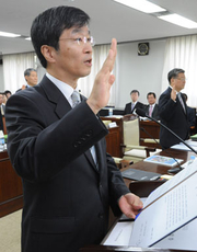 8일 서울시교육청에서 열린 2010국정감사에서 곽노현 교육감이 감사에 앞서 증인선서를 하고 있다.
