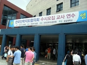 다음달 8일부터 시작되는 대입 수시모집을 앞두고 공교육 교사들이 함께 모여 대입 진학지도와 관련된 연수를 실시하였다. 8월 28일 숭실대 한경직 기념관에서 진행된 이날 행사에는 전국에서 몰려든 고3 진학지도교사들이 강당을 가득 메우고 자리가 부족하여 별도의 강당에 멀티비전을 설치할 정도로 교사들의 관심과 호응이 높았다. 오전 10시부터 오후 6시까지 8시간 동안 진행된 이날 연수에서 선생님들은 강사의 말 한 마디도 놓치지 않기 위하여 열심히 경청하는 등 제자들의 진로를 위해 최선을 다하는 모습을 엿볼 수 있었다. [연수가 진행된 숭실대 한경직 기념관] [대입 전문 강사가 열띤 강연을 하고 있는 모습] [자리가 부족하여 복도에 앉아서 강연을 듣고 있는 선생님들] [연수 교재를열심히 보고 있는 선생님의 모습] [연수 교재에 실린 내용을 하나라도 놓치지 않으려는 모습] [연수 교재에 밑줄을 치며 열심히 듣고 있는 선생님의 모습]
