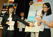 26일 고려대 국제관에서 열린 '제2회 청소년 사회참여 발표대회'에서 외대부속외고 학생들이 '새터민가정연계프로그램'이란 주제로 발표를 하고 있다. 고려대 한국사회연구소와 민주화운동기념사업회 공동 주최로 77개팀 443명의 청소년들이 참여한 결과 중예비심사를 거친 16개 모둠의 정책 아이디어가 본선에 올라 26일 고려대 국제관에서 대회를 펼치고 있다.