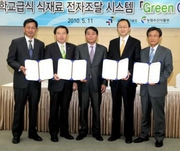 농수산물유통공사(aT) 11일 서울 양재동 aT센터에서 부산·인천·전북·충남 등 4개 시·도교육청과 ‘그린 클린(GREEN CLEAN) 협약식’을 갖고 올 2학기부터 학교급식 식재료 전자조달 시스템을 시범 운영하기로 했다. aT 측은 “지금까지는 식재료를 조달하려면 15단계의 복잡한 과정을 거쳐야 했지만 aT 사이버거래소 전자조달 시스템을 이용하면 각 학교는 식단 작성 후 입찰등록을 하고, 업체는 전자투찰을 통해 납품하면 되기 때문에 시장조사·낙찰 결정 등의 단계가 대폭 축소된다”고 밝혔다. 사진 왼쪽부터 서명범 충남부교육감, 김찬기 전북부교육감, 윤장배 aT 사장, 정석구 부산부교육감, 변광화 인천부교육감.