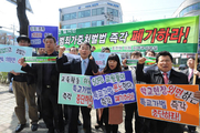 한국교총과인천교총은 15일 인천 남동구 조전혁(한나라당) 의원 사무실 앞에서 '특정교육관련 범죄가중 처벌등에 관한법률' 즉각 폐기를 촉구했다. 김경윤 한국교총 사무총장이 조전혁 의원사무실을 항의 방문해이성세 사무국장에게 항의서한을 전달하고 있다.