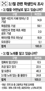 전국 초·중·고 학생 10명 중 4명이 3·1절의 의미에 대해 모르는 것으로 나타났다. 한국교총이 지난달 18~24일 전국 초·중·고생 3919명을 대상으로 실시한 설문조사(신뢰수준 95%· 표본오차±1.6%포인트)에 따르면, 응답자의 59.1%만이 3·1절을 ‘독립운동을 기념하기 위한 날’로 알고 있는 것으로 답했다. ‘나라를 위해 목숨을 바친 애국선열을 추모하기 위한 날’로 알고 있는 학생이 18.9%, ‘일본의 식민지 지배에서 벗어난 것을 기념하기 위한 날’로 아는 학생이 14.9%, ‘모르겠다’가 5.1%로 나타나는 등 40.9%의 학생이 3·1절에 대해 정확히 알지 못하는 것으로 조사됐다. '3·1절 노래를 알고 있습니까'라는 문항에도 ‘잘 모른다’고 응답한 학생이 46.3%, ‘3·1절 노래가 있는 줄 모르고 있었다’는 학생이 24.8%로 집계됐다. 3·1절 노래를 ‘정확히 알고 있다’는 학생은 6.5%에 불과해 국가 의례에 대한 지식이 부족한 것으로 분석됐다. 한편, 애국가, 태극기 등 국가상징에 대한 지식에서도 미흡한 부분이 그대로 드러났다. ‘애국가를 4절까지 부를 수 있는지’에 대해서는 응답자의 55.7%만이 ‘4절까지 부를 수 있다’고 답했고, ‘태극기를 정확하기 그릴 수 있나?’라는 문항에는 ‘정확하지는 않지만 비슷하게 그릴 수 있다’는 학생이 64.4%로 압도적이었다. ‘정확하게 그릴 수 있다’는 학생이 30.9%, ‘전혀 그릴 수 없다’도 4.7%로 나왔다. ‘우리나라를 어떻게 생각하느냐’에 대해 응답자의 47.7%는 ‘항상 자랑스럽게 생각한다’, 43.9%는 ‘스포츠경기 우승 또는 우수한 제품수출 강국이라는 소리들을 때 자랑스럽다’라고 밝혔다. ‘자랑스럽게 생각해 본 적 없다’와 ‘잘 모른다’도 각각 4.6%, 3.7%가 나왔다. 이명희 공주사대 교수는 “많은 학생들이 국가의례나 상징에 대한 지식을 모르는 것은 국가 공동체의 법, 규칙 등을 지키고 더불어 사는 자질을 형성토록 하는 인성교육의 부재가 원인”이라며 “국가에 관한 예절이 내면화될 수 있도록 헌법과 국가이념에 대한 교육을 내실화하고 공론화해야 한다”고 강조했다.