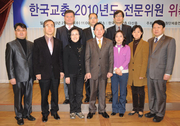 한국교총(회장 이원희)은 2층 다산홀에서 교총의 교육·교원 정책 현안 등에 대해 자문 및 협력 활동을 할 전문위원 10명에 대한 위촉식을 가졌다. 위촉식에 참석한 '한국교총 2010년 전문위원'들이 기념사진을 찍고 있다.뒷줄 왼쪽부터 시계방향으로 이영민(전북 익산 전부기계공고 교사), 곽태훈(경기 수원 태장중 교사), 이경호(서울 성일초 교사), 지윤섭(서울 영훈고 교사), 안희정(서울 신정여중 교사), 민부자(서울 신창초 교사), 이원희(교총회장), 신옥주(서울 영서초 교장), 장은조(서울 광영고 교사), 한희섭(인천 부평초 교사). 정찬기(광주 용봉중 교사) 전문위원은 불참.