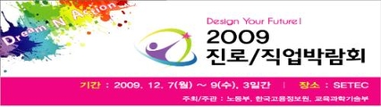 교육과학기술부와 노동부가 주최하고 한국고용정보원이 주관하는 "Design your Future !"라는 슬로건으로 『2009 진로․직업 박람회』가 2009. 12. 7(월) ~ 12. 9(수), 3일간 한국무역전시컨벤션센터(SETEC), 제 3전시실에서 개최된다. 대학 학과선택을 앞두고 있는 고3수험생, 인문계 및 전문계 고등학생, 중학생, 교사, 진로교육담당자, 학부모 등이 참여할 수 있다. 진로선택을 앞둔 청소년(수험생)이 자신의 적성과 직업(취업) 동향을 파악하여 학과 및 직업을 선택할 수 있도록 유도하고자 하며 특히 고3 수험생들이 입시시험 직후 진로에 대해 구체적인 고민을 할 때이므로 적성, 학과, 직업 등 진로와 관련한 종합적인 정보를 제공받을 수 있다. 특히 분야별 50여개의 직업에 대한 체험기회를 제공하여 생동감 넘치는 직업정보를 제공하고 관련 학과의 정보도 함께 제공하여 학과, 직업, 취업 등 진로 관련 콘텐츠를 One-Stop으로 얻을 수 있다. 그 구성내용을 좀더 자세하게 살펴보자. 자기이해관에서는 자신의 적성과 흥미에 맞는 직업과 학과를 알려 주는 무료 심리검사서비스를 제공하고 검사 후 즉시 결과를 출력하여 검사결과에 대한 전문가의 설명(별도의 세미나 룸에서 검사 및 컨설팅 실시)을 들을 수 있다. 제공 서비스는 한국고용정보원의 ‘청소년 직업흥미검사’(30분 소요), 와이즈멘토의 ‘학과계열검사’(40분 소요)이다. 다음은 테마별 진로/직업정보관(직업체험관)이다. 슬로건인 "Design your Future !"의 “Design”으로 테마별 직업체험관을 구성하였다. Dream은 전시장 입구의 Mission "Find your Dream“zone으로 진로/직업 관련 자료 배치 및 요약 핸드북 배포를 통해 다양한 정보를 제공한다. 학과별 주요 진출직업을 담은 소책자, 박람회 리플렛, Job Map, 기념품(비닐파일 등) 등을 배포한다. 두 번째인 Enjoysms에서는 문화, 미디어, 개인서비스 관련 직업 및 학과(만화가, PD, 기자, 헤어디자이너, 바리스타 등)를 다룬다. 세 번째, Social에서는 공공서비스, 의료/보건/사회복지 관련 직업 및 학과(소방관, 응급구조사, 물리치료사, 과학수사대 등)을 다룬다. 네 번째인 Intelligence에서는 전기/전자/정보통신, 금융관련 직업 및 학과(로봇공학기술자, 전자공학기술자, 항공기조종사 등)을 다룬다. 다섯 번재인 Global Future에서는 해외 유망직업 및 미래 신성장동력 직업을 소개한다. 여섯 번쩨인 New는 이색직업(Jobs in Media) 및 이색학과를 소개한다. 부대행사관에서는 만나고 싶은 직업인, 청소년 진로 전문가 특강, 직업진로지도 세미나 등, 직업퀴즈대회, 비보이공연 등 각종 이벤트 행사를 진행한다. 이번 박람회가 갖는 의미는 다음 몇가지와 같다. 첫째, 교육과학기술부와 노동부가 공동으로 개최한다는 것이다. 과거 각 부처가 단독으로 실시하는 경우가 많았으나 이번에는 교과부와 노동부가 공동으로 개최한다는 것이다. 둘째,12월 8일 수능점수결과를 받고 대학학과를 선택하여야 하는 수험생들에게 도움이 되는 박람회가 될것이다. 수험생들이원서를 작성하기 이전에 박람회를 방문하여 직업흥미검사와 학과검사를 하고 상담을 받는 것이다. 자신이 희망하는 학과를 졸업하면 어떤 전공을 가질 수 있는지 살펴보는 것이다. 학과별 주요 진출직업을 담은 소책자를 받아 전공선택에 참고하는 것이 좋을 것이다. 이것은 대학입시박람회와는 성격이 다른 것이다. 세째, 해외 유망직업 및 미래 신성장동력 직업을 참고하여 지금 당장이 아닌 10년후를 직업세계가 어떻게 변화할것이고 이에 대비하자면 무엇이 필요한가를 알게 되는 것이 중요하다고 본다. 이번에 처음 진행되는 진로직업박람회에학교 당국자나 학부모, 학생들의관심을 두기를 바란다.