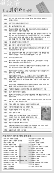 ‘한글은 곧 우리 민족의 혼’ 민족주의적 언어관 한글문화창조·문자 과학화·한글세대 형성에 기여 주시경 선생을 통해 한글을 만나다 외솔 최현배는 1898년 10월 19일 경상남도 울산군 하상면 동리(現 울산시 중구)에서 최병수의 맏아들로 태어났다. 외솔은 어려서부터 총명하여 어른들의 칭찬을 한 몸에 받았으며, 6살 때 서당에 다녔고, 울산 일신학교(現 병영초)에서 신식 교육을 받았다. 일신학교를 졸업한 후 외솔은 혼자 경성에 올라와 한성고등보통학교에 입학시험을 봤다. 전국에서 75명만 뽑는 수제들의 학교에 합격했지만 불행하게도 1910년 8월 29일 경술국치로 나라를 일제에게 빼앗기고 말았다. 따라서 학교 이름도 경성고등보통학교로 바뀌고 교장도 일본인으로 바뀌었다. 나라 잃은 슬픔과 울분에 방황하던 외솔은 김두봉의 안내로 한힌샘 주시경 선생을 만났다. 상동교회에서 열린 조선어 강습에서 주시경 선생을 처음으로 만나는 것이다. 상동교회는 당시 전덕기 목사가 담임목사였는데 독립운동의 본산지로서 많은 애국지사들이 모이는 곳이었다. 여기에서 외솔은 주시경 선생을 통하여 ‘한글’과 ‘나라사랑’이라는 두 주제를 만난다. 이로서 주시경 선생은 외솔의 연원한 스승이 됐고, 국어학자와 조국의 독립이라는 애국지사의 길을 걷게 되는 중요한 계기가 됐다. 경성고보 3학년 때, 일본인 담임 다까하시(高橋亨)가 외솔을 불러 세우고, “대종교에 다니는 것은 좋지 못하니 그만두라”고 일렀다. 그래도 외솔은 계속 대종교에 다니면서 민족혼을 일깨웠다. 그리고 상동교회 국어강습소가 조선어강습원으로 확대 개편되자 다시 입학하여 주시경 선생의 가르침을 2년 동안 더 받고 1913년 3월에 고등과 제1회로 졸업하였다. 조선어강습원의 졸업 성적도 99.5점이라는 아주 뛰어난 점수였다. 외솔은 주시경 선생의 학문만이 아니라 민족사상을 철저히 물려받았다. ‘조선어는 곧 조선민족의 혼’이라는 민족주의적 언어관을 그대로 이어받았다. 페스탈로치 교육 사상 처음 들여와 외솔은 경성고보 졸업과 함께 유일하게 유학생으로 뽑혀, 1915년에 일본으로 건너가 히로시마 고등사범학교에 입학했다. 1919년에 졸업했으며, 동시에 중등학교 교원 자격증을 받았다. 히로시마 고등사범학교에서 수신·교육·일어·한문·법제·경제 과목의 교원 면허증을 얻고 귀국했다. 여기서 외솔은 페스탈로치 교육을 받아들여 이를 우리나라에 처음으로 소개했다. 외솔은 병을 핑계로 일제의 교원이 되길 거부하고 고향 울산에서 우리의 물건을 값싸게 사고파는 공동상회를 주민들과 함께 설립, 운영했다. 고향의 순박한 이웃들에 파묻혀 민족혼을 일깨우던 외솔은 부산의 사립 동래고보의 초빙을 받고 1920년부터 두 해 동안 이곳에서 조선어 독본과 발본을 가르쳤다. 그리고 좀 더 배우는 것이 일본을 이기는 길이라는 일념으로 다시 일본으로 건너가 1922년에 교토제국대학 문학부 철학과에서 공부하고, 1925년 동대학원에서 1년간 수업했다. 일본유학 뒤 돌아와 1926년 4월부터 1938년 9월까지 연희전문학교 및 이화전문학교 교수로 근무하면서 우리말과 글의 과학적인 연구에 몰두했다. 나라를 잃고 방황하던 조선 사람들에게 1926년에 66회에 걸쳐 ‘조선민족 갱생의 도’를 동아일보에 연재했다. 1930년 책으로 펴내어 민족의 삶을 위한 자각의 필요성을 부르짖었다. 외솔은 나라를 잃은 원인을 찾아 고치고, 새로운 정신을 갖추어야만 진정한 독립을 이룰 수 있다고 판단했다. 이를 극복해야 일제의 말살 정책에서 민족이 다시 살아날 수 있다고 생각했다. 외솔은 이 책에서 민족이 중병과 쇠약증에 걸려 있음을 진단하고, 그 결과는 ‘의지의 약함, 용기의 없음, 활동성의 모자람, 신념의 부족’으로 나타남을 지적했다. 그 치유 방법으로 ‘도덕 경장, 경제 진흥, 생활 방식 개선, 민족 고유문화의 떨침’ 등을 들었다. 그리고 우리 말·글의 연구와 교육만이 우리 민족을 되살리는 기본 방법이라고 역설했다. 국어학사 집대성한 ‘한글갈’ 외솔은 1926년에 연희전문학교(現 연세대)의 교수가 됐다. 그는 교수로서 연구하고 교육하는 것은 물론이고, 독립 항쟁과 민족 운동에도 가담했으며, 특히 조선어연구회(現 한글학회)의 주역으로 적극 활동했다. 광복 후에는 문교부 편수국장을 맡아 각급학교 교과서를 편찬․간행하는 일에 정열을 쏟았다. 국어와 셈본을 비롯하여 역사, 생물, 음악 등의 학술 용어를 한글로 고치고 다듬어서 편찬하는 공로를 세웠다. ‘흥업구락부’는 1924년에 결성된, 기독교 장신을 바탕으로 애국 사상을 계몽하고 실력을 기르는 운동을 하는 단체였다. 이 단체는 미국에서 활동하는 독립 운동가들을 돕고, 국내에서도 강한 독립운동을 펴는 등의 큰 역할을 했다. 일본제국은 1938년 ‘흥업구락부’를 반제국적인 단체로 규정하고 관계자들을 대대적으로 검거했다. 이때에 외솔도 일본 경찰에 검거돼 서대문 경찰서에서 석 달 동안 악독한 옥고를 겪었으며, 연희전문하교 교수직에서도 강제 퇴직을 당했다. 그러나 외솔은 이 혹독한 탄압에 굴하지 않고 이 기간에 한글에 관한 모든 자료를 모아서 국어