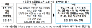 교육부가 학교 중심 방과후 돌봄·교육이었던 초등 늘봄학교의 운영를 지역사회로 확대해 ‘온동네 초등돌봄·교육’으로 전환한다. ‘지역 초등 돌봄·교육 협의체‘ 운영에 100억 원을 투입하고, 3학년에게 연 50만 원의 방과후 프로그램을 제공한다. 교육부는 이와 같은 내용을 담은 ‘2026년 온동네 초등돌봄·교육 추진 방안’을 3일 발표했다. 수요 조사 결과 초 1~2학년은 돌봄 중심, 3학년부터는 교육 중심으로 진행한다는 방침이다. 작년 8월 초2 학부모 대상 ‘초3 이후 돌봄·교육에 대한 인식’ 조사 결과 ‘참여 시간이 줄더라도 우수한 프로그램과 선택권 보장 희망’이 53.9%였고, 지난달에는 ‘돌봄보다 교육활동 확대 필요’가 75.0%로 나타났다. 작년 돌봄 참여율 조사에서도 초3 6.0%, 초4 2.2%, 초5 1.0%, 초6 0.8%였다. 이에 초3~6에게는 전면 돌봄보다 사각지대 해소 중심의 지원이 더 효과적이라는 분석이다. 이를 위해 돌봄과 교육의 지원 주체를 학교뿐 아니라 지역사회까지 확대한다. 지역별로 학교가 지자체와 함께 돌봄·교육을 제공하고 관계 부처는 지역별 수요에 맞는 자원을 제공한다. 중앙에서는 관계 부처가 참여하는 ‘온동네 초등 돌봄·교육 협의체’를, 전체 광역·기초 지자체에서는 지자체와 교육(지원)청 등이 참여하는 ‘지역 초등 돌봄·교육 협의체’를 운영하기로 했다. 교육부는 지역별 협의체 운영을 활성화하기 위해 올해부터 협의체 운영비 100억 원을 지원한다. 교육부는 기존 교육(지원)청이 운영하는 거점형 늘봄센터를 ‘온동네 돌봄·교육센터’로 개편하고 15개소 추가 마련에도 나선다. 이 센터는 작년 9월 기준 전국에서 92개 센터 운영 중으로 총 533개교가 참여하고 있다. 이용 학생 정원 합계는 1만172명(이용 가능 최대 인원), 일 평균 참여 학생은 약 6300명이다. 올해 추가 설치로 약 4000명 더 수용할 수 있을 전망이다. 돌봄보다 교육 수요가 높은 초3에게는 1060억 원의 예산을 들여 ‘방과후 프로그램 이용권’ 연 50만 원을 지급하기로 했다. 이를 통해 작년 40%대의 이용률을 올해 60%대까지 끌어올린다는 계획이다. 올해 운영 후 평가를 거쳐 초4 이상까지 확대를 검토한다는 방침이다. 부산과 인천 등 6개 시·도교육청은 간편결제(제로페이) 연계 방식을 시범 도입하기로 했다.