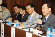 17일 한국교총과 정영희 교육위원(친박연대) 공동으로 주최한 '교원잡무경감 입법을 위한 공청회'에서 신상명 경북대 교수가 학교교육력 제고를 위한 교원잡무 경감방안에 대한 주제발표를 하고 있다. 17일 한국교총과 정영희 국회의원(오른쪽 두 번째)이 주최한 교원잡무 경감방안 공청회에는 심대평 자유선진당 대표, 이규택 친박연대 공동대표, 김을동 친박연대 의원, 노철래 친박연대 의원, 정해걸 한나라당 의원 등 정치권 인사들이 대거 참석했다.