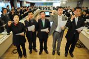 한국교총(회장 이원희)은 25일제290회 이사회 참석자 일동과 회장단이 함께 국가경쟁력 강화를 위한 결의문을 채택했다. 참석자들은 입학사정관제 정착 방안 및 교육공무원승진규정 재개정 등 공무원연금법 개정의 '사회적 합의안'을 조속히 처리할 것을 강력히 촉구했다. 제290회 이사회에서 제89회 정기대의원회 보고사항 이후 사업추진 사항에 대해 보고하고 있다. 보고사항이 끝난 뒤 참석한 이사들이이의없음을 박수로 화답하고 있다.