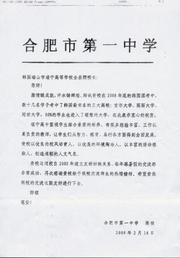 우리학교와 자매결연을 맺은 중죽 합비 제1중학교에서 보내온 편지랍니다. 우리 서령고가 2009학년도 입시에서 좋은 성적을 거둔 것을 축하한다는 내용으로 중국어 선생님의 도움을 받아 원문과 번역문을 함께 싣습니다. 한국 서령고등학교 김기찬 교장선생님께 안녕하십니까! “정열은 성취의 미태요, 땀방울은 휘황찬란한 꿈의 실현”인가 봅니다. 귀교의 지난 대학입시 결과에 대하여 반가운 소식을 들었습니다. 십 수명의 학생이 한국 3대 대학인 서울대학, 고려대학, 연세대학에 합격하였고, 80% 이상의 학생이 목표한 대학에 진학하였다니, 충심의 축하 말씀을 드리는 바입니다. 서령고등학교는 학생의 종합적 소질 계발에 중점을 두어 교육하는 것으로 알고 있습니다. 또한 성실하고 풍부한 경험을 갖고 계시는 선생님들이 학생들의 지력(智力)과 덕육(德育) 그리고 품행 등 각 방면에 걸쳐 전인적인 교육활동을 펼치고 있다고 생각됩니다. 또한 귀교는 우수한 교풍(校風)과 훌륭한 환경 속에서 학생을 교육하고, 다양한 활동을 통하여 학생들 개개인이 감수성을 계발하도록 지도하고 있는 줄 압니다. 2002년 귀교와 본교가 자매학교 결연 후 진행하고 있는 매년 두 차례의 교류는 매우 성공적이라고 생각하고 있습니다. 귀교가 본교의 교사와 학생들에게 베풀어주신 환대에 다시 한 번 감사 드립니다. 귀교와 본교의 교류가 계속 발전해 나가기를 희망합니다. 안녕히 계십시오. 2009년 2월 16일 합비시 제일중학교장 진동
