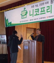 동암중학교(교장 권태국)가 3월 2일 신입생 입학식과 함께 ‘니코프리(Nico-Free) 스쿨 프로젝트’에 참여하기 위한 니코프리 선언식을 가져 학부모는 물론 지역사회의 관심을 끌고 있다. 이날 행사는 전교생을 대상으로 ‘담배연기 없는 학교’ 만들기를 목표로 한국금연운동협의회가 함께 손을 잡고 선언식과 함께 하늘색의 ‘금연 리본’을 담임교사가 학생의 가슴에 직접 달아 주고, 학생들이 직접 서약서를 썼다. 선포식 이후에는 금연 예방 교육과 함께 흡연 학생들에 대한 5주간의 금연 클리닉이 실시되며 이날 교내에서 뽑힌 또래 지도자 약 30여 명은 학생들의 흡연 예방과 금연 교육에 대해 교육을 받은 후 금연지도자로서 활동할 예정이어서 그 효과가 클 것으로 예상된다. 현재 청소년 흡연율은 7%로 남자 중학생 5.7%와 남자 고등학생 18%가 담배를 피우는 것으로 나타나고 있는데 고등학교의 흡연율은 낮아져 가는 반면 중학생의 흡연율은 거꾸로 높아지는 등 우리 학생들의 흡연 연령층이 점점 낮아지고 있다는 사회적 우려가 큰 이 시점에서 동암중학교의 ‘담배없는 학교’ 캠페인은 큰 의미를 지니고 있다. 이날 행사에 참여한 강승수 학생은 “저희 반에도 담배 피는 아이가 있었는데 지금은 학교에서도 못피우게 하고, 자기들도 노력해서 다 끊었다”며 “중학교 때 습관이 평생을 가기 때문에 중학생일 때 미리 예방 교육을 하는 것이 좋다.”고 소감을 밝혀 이날의 행사가 학생들에게 금연에 대한 경각심을 불러 일으켰음을 알 수 있었다.