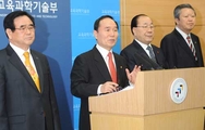 안병만 교과부 장관이 16일 교과부 블리핑 제4실에서 '2008년도 학업성취도 평가결과 및 기초학력 미달학생 해소 방안'을 발표하고 있다. 좌로부터 안순일 광주시교육감, 안병만 교과부 장관, 공정택 서울시교육감, 신상철 대구시교육감. 교과부는 학교간.지역간 학업성취도 상향평준화를 위해 "뒤처지는 학생 없는 학교 만들기" 해소 방안을 발표하고 있다. 이날 안 장관을 비롯한 시도교육감이 참석해 기초학력 미달학생 해소 방안을 위해 함께 노력하기로 했다.