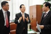 한국교총(회장 이원희)은 9일 조진형 행정안전위원장을 방문한 자리에서 공무원연금법 개정과 관련해 교육현장의 목소리를 전달했다. 좌로부터 윤석진 인천교총 회장, 조진형 행안위원장, 이원희 한국교총 회장. 한국교총은 국회와 정치권이 연금개혁에 대한 사회적 합의안을 존중한다며 금년 정기 국회 중 정부안대로 공무원연금법 개정이 처리 되기를 요망했다.