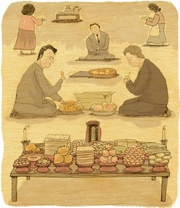 마당에도 안 계신다. 마루에도 안 계신다. 서둘러 사랑방 문을 여니 한겨울 오후의 옅은 햇살이 냉기 가득한 빈방을 지키고 있다. 가슴이 미어지더니 뜨거운 눈물이 펑펑 솟는다. 돌아가신지 25년이 지났건만 고향집에만 오면 아이처럼 아버지가 보고 싶다. 아내가 흉볼까봐 서둘러 눈물을 닦고 새로 지은 안채로 건너간다. 현관을 들어서니 형님 두 분과 형수님 두 분 그리고 제수씨가 이미 제사 음식을 장만하시느라 분주하다. 형제를 만나는 반가움이 아버지에 대한 그리움과 회한을 밀어낸다. 나는 세상의 모든 직함을 버리고 그저 계산댁 셋째 아들이 된다. 작은 방으로 가서 편한 옷으로 갈아입고 거실로 나온다. 깨끗이 씻은 문어, 돔베기, 쇠고기 그리고 고등어 등이 소반에 담겨있고, 널찍한 도마에 놓인 큰 칼은 새파랗게 날이 서 있다. 손을 씻고 무릎을 꿇어 조심스럽게 도마 앞에 앉아 어육을 장만하기 시작한다. 어육을 장만하는 특별한 일은 의례히 두 분 형님께서 맡아하셨다. 어육을 다루는 절제된 손길과 경건한 표정을 바라보면서 형님들의 아버지에 대한 흠모의 지순함을 느낄 수 있었다. 영모의 숭고가 열락으로 승화하는 아름다움을 보았다. 몇 해 전에 어육 장만하는 일을 물러 받고 몹시도 두려웠던 것은 내 거친 성정과 서투른 솜씨에 대한 내 불신 때문이었다. 나는 오늘도 여전히 두렵다. 문어 다리 하나를 잘라 도마 위에 올린다. 허물거리는 검붉은 껍데기를 말끔하게 벗겨내고 한 치 반 정도의 길이로 도막을 낸다. 도막난 문어를 다시 세로로 서너 조각 나누어 꼬치에 꿸 수 있도록 저름(점)을 만든다. 아버지는 문어를 참 좋아하셨지만 비싸서 자주 드시지 못했다. 문어를 사 오시면 한꺼번에 드시지 않았다. 한겨울에는 사랑채 석가래 끝에 꽁꽁 얼도록 매달아놓고 조금씩 잘라 드셨다. 돌아가시기 몇 해 전부터 내가 가끔 문어를 사드린 까닭으로 제사상에 올릴 문어 사는 일은 내 몫이 되었다. 문어 저름이 만들어지면 속살이 위로 올라오도록 꼬치에 꿴다. 전에는 산에서 베어 온 싸리나무로 만든 꼬치를 썼는데, 요즈음은 시장에서 파는 대나무 꼬치를 사서 쓴다. 저름 사이가 너무 빽빽하면 융통성이 없어 격이 낮아 보이고, 너무 헐렁하면 실속이 없어 보인다. 꼬치가 다 꿰어지면 뾰족한 끝을 칼로 다듬어 마무리 한다. 제사에 관한 모든 결정은 큰형님께서 하신다. 문어를 미리 맛보는 일도 큰형님의 일이다. 큰형님께서 문어를 잘 샀다고 고개를 끄덕이신다. 다행이다. 제사상에 올리는 음식은 언제나 최고여야 한다는 것은 예나 지금이나 같다. 큰형님은 고향에서 농사를 지으신다. 아버지의 뜻에 따라 아버지 곁에 계시면서 부모님 봉양과 동생들 치다꺼리로 힘든 삶을 사시면서 섭섭해도 화내지 않으시고, 앙탈을 부려도 나무라지 않으셨다. 형제들이 모이면 고향 사람들이 살아가는 모습을 전해주시는 일이 커다란 즐거움이다. 우리는 오늘도 형님의 이야기를 들으면서 각자의 유년시절로 돌아간다. 거기에서 때 묻지 않은 삶의 원형을 만난다. 큰형님을 통해 아버지를 만난다. 문어 다음에는 돔베기를 꿴다. 돔베기 장보기는 여간 힘 드는 일이 아니다. 어떤 때는 살이 희고 졸깃졸깃하여 감칠맛이 나는데, 어떤 때는 윤기가 없고 터벅터벅하여 나무껍질을 씹는 것 같다. 익혀서 먹어보기 전에는 알 수 없으니 안타깝다. 장사꾼을 믿거나 운을 따를 수밖에 없다. 돔베기는 길이가 어정쩡하여 저름 만들기가 어렵다, 두 도막을 내면 너무 길고, 세 도막을 내면 너무 짧다. 올 해는 큰 맘 먹고 두 도막을 내어서 저름을 큼직큼직하게 만든다. 형제들의 살림살이가 큼직한 돔베기 저름처럼 더 넉넉하고 더 풍족해지기를 기원하는 마음이다. 주차하는 소리가 나더니 동생이 현관을 들어선다. 짧게 깎은 머리와 굳게 다문 입술이 강단해 보인다. 동생은 공부를 많이 못했다. 공부를 잘했지만 집안 형편이 여의치 못해서 중간에 그만 둬야 했다. 배운 것이 적은 동생의 삶은 평탄하지 못했다. 아버지께서 두고두고 가슴 아파하셨다. 아버지께서 돌아가셔도 동생은 그저 덤덤할 뿐 슬퍼하지 않았다. 외롭게 하늘만 쳐다보았다. 많은 세월이 흐른 뒤에야 아버지에 대한 원망을 삭이고, 세상을 향하여 마음을 열었다. 이제 웃는 얼굴로 형님들 곁에 앉는다. 동생이 합세하자 집안 분위기가 한층 더 화기애애하다. 고향 이야기를 넘어 정치, 경제, 사회 그리고 문화 영역으로 번져간다. 차분하던 큰형님의 목소리는 점점 커진다. 작은 형님도 이에 질세라 목청을 돋우고, 동생도 있는 힘을 다해 거든다. 말 주변 없는 나도 있는 말 없는 말을 보탠다. 형제간에 불화를 많이 겪으셨던 아버지는 아홉 남매가 정 있게 사는 것이 소원이었다. 그래서 우리에게 형제는 진위, 선악 그리고 미추를 초월하여 존재한다. 돔베기를 다 꿰면 쇠고기를 잘라 저름을 만든다. 쇠고기는 시내에 사시는 작은 형님께서 식육점을 하는 친구에게 특별히 부탁하여 사 오신다. 선명한 붉은색에 하얀 기름이 고르게 퍼져있는 최고급 쇠고기이다. 쇠고기에는 아버지의 속을 가장 많이 썩혀 드린 작은 형님의 속죄하는 마음이 담겨있다. 쇠