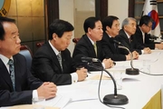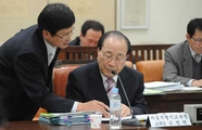 24일 국회 교육과학기술위 특별상임위에서 국제중 설립과 관련된 답변을 위해공정택 서울시교육감이 양종만 교육지원국장으로부터 관련자료를 검토하고 있다. 민주당 김영진 교육위원이 국제중 재심의 때 여당의 실세의원 외압의혹 및국정감사시 공정택 서울시교육감의 증인 불출석 등과 관련해 안민석의원(左), 김진표 의원(右)과 의논하고 있다.