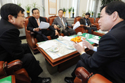 18일 이원희 한국교총회장, 김진성 부산교총회장, 이명우 부산교육위원이 서병수 기획재정위원장(한나라당)을 방문한 자리에서교육세 폐지와 관련해 당면 교육현안에 대한 협조를 당부하고 있다.