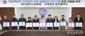대구교육청이 2026학년도 늘봄학교 운영을 위해 지역대학과 업무협약을 체결하고, 맞춤형 프로그램을 확대 운영한다. 대구교육청은 27일 대구 수성구 교육청 여민실에서 대구교대, 김천대, 대구가톨릭대, 대구한의대, 대구예술대, 대구대, 대구공업대, 대구사이버대, 동국대, 영남대 등 지역대학 10곳과 ‘2026학년도 늘봄학교 프로그램 운영’을 위한 업무협약(사진)을 맺었다. 이번 협약은 지난해 11월 공모한 ‘지역대학 연계 늘봄학교 프로그램 운영 사업’에 따라 추진됐으며, 협약 내용에는 늘봄 프로그램 운영을 위한 프로그램 및 강사 지원이 포함됐다. 선정된 프로그램은 치어리딩, 디지털드로잉, 3D펜 창작교실, 스내그골프, 마음성장 프로그램 등 초등 1~2학년 학생의 흥미와 발달 단계를 반영한 56종으로, 1학기에는 3월부터 257개 교실에서 운영된다. 2학기 프로그램은 6월 중 학교 신청을 받아 학사 일정에 맞춰 운영될 예정이다. 강은희 대구교육감은 “지역대학과 협력해 학생들이 다양한 늘봄 프로그램을 경험할 수 있도록 하겠다”고 말했다.