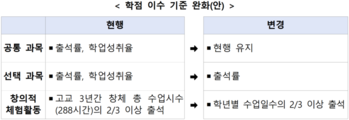 교육부가 ‘고교학점제 안착을 위한 지원 대책’으로 창의적 체험활동 이수기준 변경, 미이수 학생의 추가 이수 방법 마련, 학교생활기록부(학생부) 일부 영역 기재 글자 수 축소 등을 내놨다. 이는 한국교총 등 교원단체들의 요구사항을 일부 반영한 것이긴 하나, 공통과목 학점이수 기준에 학업성취율을 그대로 남겨두는 등 현장이 체감할 수 있는 지원 대책으로 보기에는 여전히 부족하다는 지적이다. 교육부는 27일 고교 학점 이수 기준 완화 관련 사항의 국교위 의결 후속 지원 대책을 발표했다. 올 신학기부터 고1~2학년 대상 선택과목의 학점 이수 기준은 과목 출석률만 적용된다. 창의적 체험활동(창체)에 대해서는 학년별 전체 수업일수의 3분의 2 이상 출석한 경우 이수한 것으로 인정된다. 특수교육대상·이주배경 등 학생의 경우 특성을 고려해 학점 이수 기준과 최소 성취수준 보장지도(최성보) 운영을 유연하게 적용할 수 있다. 과목 미이수 시 온라인 콘텐츠를 통해 학점을 취득할 수 있는 플랫폼도 개발(기존 한국교육개발원의 ‘온라인 보충과정’ 플랫폼을 개편·활용)된다. 온라인학교와 공동교육과정 거점학교 등에 정규교원이 추가 배치(올해 777명)되고, 농산어촌·소규모 학교(442교) 등의 강사 채용이 지원된다. 초·중 학습 결손 누적 예방 차원에서 2월 내 개통되는 국가기초학력지원포털에서 학습지원대상학생(초1~고2)의 선정부터 성취수준 보정 자료도 종합적으로 제공될 전망이다. 고1 공통과목의 기초학력 지도가 최성보와 연계 운영된다. 에듀넷(www.edunet.net)을 통해 공통과목의 최성보 수업 지원 자료가 배포되고, 추후 선택과목 관련 수업자료도 추가될 예정이다. 담임교사가 작성하는 학생부 항목의 기재 글자 수는 200자씩 축소된다. 누가기록은 학교에서 자율적으로 작성 여부를 결정할 수 있으며, ‘과목별 세부능력 및 특기사항’은 학업성적관리위원회 심의를 통해 부득이한 경우 기재하지 않을 수 있도록 한다. 이번 지원 대책과 관련해 교원3단체는 공동 성명을 내고 “공통과목 학점이수 기준에 학업성취율이 유지된 것은 최성보가 여전히 형식적으로 운영될 수밖에 없는 구조의 고착화 가능성이 높다”며 “학생부 기재량 축소는 선택과목까지 이뤄져야 한다”고 밝혔다. 진로/융합 선택과목 상대평가 유지 또한 학생들의 과목 선택이 ‘내신 유불리’에 의해 결정되고 있어 수강 인원이 많은 과목 쏠림, 학생 수 다수 학교 선호 현상 심화가 우려되고 있다. 이에 대해 교총 등은 “이미 사교육 기관들은 어느 학교가 내신 경쟁에서 유리한가를 기준으로 고교 진학 컨설팅을 하고 있으며, 이는 고교학점제가 오히려 학교 서열화, 입시경쟁체제를 강화하고 있음을 보여주는 단적인 사례”라고 주장했다. 이들은 온라인학교, 공동교육과정 확대도 지역의 소규모 학교 차별을 심화시킬 것으로 보고 있다. 교원3단체는 “3월부터 선택과목 본격 수강이 시작되면, 작년과는 다른 혼란과 어려움이 발생할 것이 예상된다”면서 “교육부 지원 대책이 문서에만 머무르지 않기 위해서는, 교원단체를 포함한 학교 현장의 목소리와 요구에 귀를 기울이는 노력이 필요하다”고 전했다. 이어 “지금의 고교학점제는 고교 교육을 정상화하는 방식으로 작동하지 않고 있다”며 “교육부는 학교 현장에서 답을 찾기 바란다”고 강조했다.