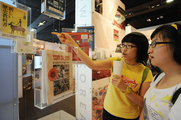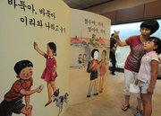 서울 정독도서관 부설 서울교육사료관은 6일부터 '철수와 영이 그리고 바둑이'를 제목으로 건국 60주년 기념 국어교과서 특별전을 열고 있다. 손수건의 용도 함께온 자녀에게 가슴에 붙여 놓은 손수건을 가리키며 사용 용도를 설명하고 있다. 650여점의 국어교과서가 전시되어 있는 가운데 표지에 실려 있는 그림을 보며 추억을 더듬고 있는 관람객들.