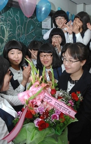 -스승의 가르침에 감사의 뜻 전해- 인천 제물포여중 2학년 5반 학생들이 스승의 날을 맞아 담임선생님에게 『선생님 건강하세요』글귀가 담긴 꽃다발을 전하며 환하게 웃는 학생들의 미소! 선생님에 대한 존경과 사랑이 가득담긴 미소일 것이라 확신한다.