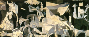 “내 학생 때의 공책 위에/ 내 작은 책상과 나무들 위에/ 모래 위에 눈 위에/ 나는 쓴다 그대 이름을” 이라는 외침으로 시작되는 ‘자유’라는 제목의 시를 써서 프랑스 최고의 저항시인으로 알려진 폴 알뤼아르(Paul Eluard, 1894~1952)와 20세기 회화의 위대한 거장 파블로 피가소(Pablo Picasso, 1881~1973)와의 관계는 남다른 예술적 동지애로 묶여진 드문 예에 속한다. 그들은 특히 ‘게르니카의 비극’이라는 처참하기 짝이 없는 인간말살의 전쟁과 파괴에 대항하여 각각 시로, 그리고 그림으로 공동의 예술적 항거를 강렬하게 보여준 점에서 높이 평가된다. 스페인 내란의 소용돌이 속에서 1937년 4월 26일 일어난 게르니카 마을의 처참한 파괴는 이 두 예술가에게 커다란 충격을 안겨주었다. 무차별 쏟아 붓는 엄청난 양의 폭탄투하로 거의 모든 주민들이 몰살 당하는 역사상 가장 끔찍스런 인간말살의 비극이었기 때문이다. 이러한 조국의 불행한 대사건에 눈 감을 수 없었던 피카소는 분연히 붓을 들어 그 해 6월 3일 ‘게르니카’(1937, 사진)라는 제목의 대형 그림을 완성한다. 6월 4일 그 그림은 엘뤼아르의 시(詩) ‘게르니카의 승리’와 함께 만국박람회의 스페인 관에 전시된다. 피카소와 아주 친근한 관계를 오랫동안 유지했던 시인 화가인 아르스는 ‘파블로 피카소’에서 이 그림이 엘뤼아르와의 뜨거운 연대감정 속에서 태어났음을 밝히면서 이렇게 설명한다. “이 그림이 제작되는 동안에도 자주 대화를 나누었던 엘뤼아르의 사상적 전개에 의해 크게 영향을 받았음이 분명하다. ‘게르니카’는 개인적인 원한과 증오의 차원을 넘어서, 스페인 내란, 프랑코의 폭력과의 투쟁을 출발점으로 하지만, 마침내 보다 더 넓은 차원의 높은 전인류적 시야로, 폭력과 전쟁과 죽음과 암흑에 대항하여, 평화와 행복한 여인과 아이들을 수호할 것을 인류에게 직접 호소하는 그림이다” 엘뤼아르가 ‘게르니카의 승리’에서 보여주고자 한 것도 ‘전 인류적인 시야’로 폭력과 전쟁과 죽음과 암흑에 맞서 투쟁하지 않으면 안되는 참여적 리얼리즘의 정신이라 할 것이다. 그는 ‘게르니카의 승리’에서 “포화에 견디는 얼굴”, “뒤집혀진 죽은 심장”, “저마다 자신의 피를 보여주는” 여인들과 아이들 등의 참혹하게 일그러진 인간의 모습을 생생하게 묘사한다. 이는 피카소가 ‘게르니카’에서 보여주고자 한 참담한 인간 파과의 영상에 대한 시적 변용으로서 동일한 전쟁에의 분노를 표출하고 있다 하겠다. 이러한 뜨거운 연대감정과 정신적 동지의식은 그들 사이의 친분관계가 기본적으로 참다운 우정을 저버리지 않는 지속적 진실성에 바탕을 두고 있으며, 무엇보다 순수한 시의 진실을 끝끝내 잃어버리지 않은 채 서로서로의 가치를 드높여 주었기 때문일 것이다.