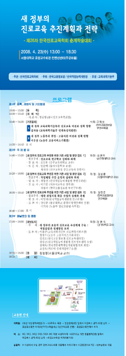 한국진로교육학회(학회장 서울대 정철영교수)는 2008. 04. 23(수) 13:30~18:30, 서울대학교 호암교수회관 컨벤션센터에서 제26차 춘계학술대회를 개최한다. 그 주제는 「새 정부의 진로교육 추진계획과 전략」이다. 문의는 한국진로교육학회 사무국 (02-880-4842)이다. 공문이 필요하신 분들은 사무국으로 연락하기 바란다. 이 회의에서는 교육과학기술부와 노동부의 진로교육 시책소개와 초중고교의 진로교육 연구학교운영, 직업세계체험주간의 성과와 과제 등 학교 현장에 도움이 되는 내용으로 구성되어 있다.