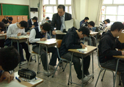 2008학년도 대학수학능력시험이 전국 78개 지구 980개 시험장에서 일제히 치러진 가운데 서울 경복고에 마련된 고사장에서 수험생들이 답안지를 작성하고 있다. '비켜 주세요' 시험장에 늦게 나타난 수험생이 자원봉사단이 운영하고 있는 운송 수단을 이용해 급하게 학교 정문을 통과 하고 있다. 수능 등급제가 첫 적용된 2008학년도 대학수학능력시험은 변별력 확보를 위해 영역별로 까다로운 문항이 상당수 출제돼 대체로 어려워진 것으로 평가됐다. 긴장감이 감도는 교실 분위기와 달리 단풍이 곱게 물든 교정이 대조를 이루며, 수험생들이 1교시 언어영역 시험을 준비 하고 있다.
