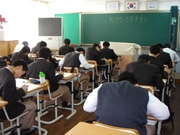 진로적성 종합검사 실시 2007학년도 1학년 학생들의 적성과 지능을 알아보기 위한 표준화심리검사가 4월 11일(수요일) 3~4교시에 걸쳐 실시되었다. 이번 검사는 1학년 학생 339명을 대상으로 총 100분 동안 실시되었으며, 검사 명은 적성종합검사(적성+지능)로 한국심리적성검사연구소 주관이다. 1교시 적성검사가 실시되고 있다. '개시'와 반대의 의미를 가진 낱말은? 1. 정지 2. 최후 3. 종료 4. 종말 적성 및 지능검사 문제가 수능문제보다 더 어려워요~ 알쏭달쏭~ 다음 낱말 중에서 네 개는 공통이고, 하나만 다른 것이 있습니다. 몇 번입니까? 1. 단풍 2. 나팔꽃 3. 국화 4. 장미 5. 벚꽃 어떤 야구팀은 30번의 시합에서 16번 이겼습니다. 남은 20번의 시합에서 몇 번을 이기야 승률 6할이 됩니까? 맨 처음 신체시를 쓴 사람은 누구입니까? '아는 길도 물어가라'와 같은 뜻의속담은? 다음 계산을 하여 올바른 답을 고르시오. 8.492-4.3은? 100분 동안 진행되는 테스트에서 아이들은 하나라도 더 맞추기 위해 안간힘을 쓰고 있다. 드디어 두 시간에걸친 테스트도 종착역을 치닫고 있네요. 휴~~