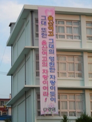 오늘은 11월이 시작되는 첫날입니다. 저는 지금 마음이 약간 들떠 있습니다. 왜냐하면 처음으로 사진을 찍은 것을 올리는 감격을 안기 때문입니다. 보기가 좋지 않습니까? 엊그제 디지털 카메라를 하나 환경부장 선생님을 통해 구입했습니다. 환경부장 선생님께서 디카 사용법에 대한 직무연수를 받았기 때문에 저에게 디카 사용하는 법을 가르쳐 주려면 가장 싼 것 하나 구해달라고 했더니 구해 왔더군요. 간단하게 사용법을 배우고서 연습을 하기 시작했습니다. 생각보다 찍기도 편리했습니다. 찍다가 잘 모르면 옆에 있는 학생부장 선생님에게 묻기도 했습니다. 한 원로선생님에게 묻기도 했습니다. 사진을 찍어서 컴퓨터에 저장하는 법과 불러오는 법, 편집하는 법, 저장하는 법 등을 배웠습니다. 이렇게 해서 오늘 올리게 됩니다. 보기 좋지 않습니까? 3층처럼 보이지만 4층 건물 옥상에서 달아놓은 것입니다. 어제는 1,2학년은 체력장을 하였습니다. 여러 선생님들께서 가을이지만 낮에는 따가운 햇살 때문에 무척 힘들었으리란 생각을 하게 됩니다. 평소에 교실 안에서 수업만 하시다가 밖에 나가시니 정말 힘드시죠? 그래도 우리들이 해야 할 일이기에 꾹 참고 잘 협조해 주셔서 잘 끝낸 것 같습니다. 정말 수고 많으셨습니다. 감사합니다. 이번 기회에 학생들은 나의 체력이 얼마나 향상되었는지 아니면 퇴보되었는지 점검을 했으니 체력관리를 잘 할 수 있도록 지도가 되어야겠습니다. 아마 학생들은 자기의 체력을 점검하면서 이래서는 안 되겠구나, 체력을 더욱 보강시켜야 되겠구나, 공부보다 체력이 우선이다, 체력이 밑바탕이 되어야 공부도 할 수 있고 무엇도 할 수 있겠구나 하면서 자신을 되돌아보았을 것입니다. 자신을 아는 것이 참 중요합니다. 체력이 약하면 체력을 보강하고 건강이 좋지 않으면 건강을 회복시키는데 늘 관심을 가져야 합니다. 내가 비만이다 싶으면 비만을 탈출하는 계획수립과 실천이 뒤따라야 합니다. 아는 것 하고 실천하는 것은 하늘과 땅 사이입니다. 꾸준히 체력관리, 건강관리, 자기관리를 잘하여 내년 체력장 때는 체력이 많이 향상되고 더욱 건강이 증진되었으면 합니다. 어제 오전에 동창회에서 수능을 16일을 앞둔 학생들과 선생님들을 격려하기 위해 빵과 우유를 가지고 오셨더군요. 그 바쁘신 가운데서도 총동창회 회장님과 총동창회 총무님께서 오셔서 학생회 회장과 3학년 반장들을 모인 자리에서 격려말씀을 하더군요. 수능을 앞두고 무엇보다 건강관리가 중요하다고요. 욕심 부리지 말고 착실히 컨디션 조절을 잘 해서 좋은 성적 얻었으면 좋겠다고 하셨습니다. 동창회에서 길다랗게 붙여놓은 격려문은 읽어보면 볼수록 깊이가 있는 말씀인 것 같습니다. 울산여고는 55년의 전통 명문 고등학교이기에 거기에 알맞은 격려문을 걸어 놓았다는 생각이 듭니다. ‘울산여고, 그대의 영원한 자랑이듯이 그대 또한 울산여고의 자랑이어라!’입니다. 그렇습니다. 울산여고는 우리 학생들의 자랑입니다. 전통 명문이기 때문이지요. 유능한 인재들을 많이 배출했기 때문입니다. 수많은 현숙한 여성들을 많이 길러내었기 때문입니다. 또한 학생들이 울산여고의 자랑입니다. 울산여고에 소속된 학생들이 바로 학교를 빛내주는 인물들이기 때문입니다. 학생들이 선생님의 가르침에 따라 사람됨이 탁월하기 때문입니다. 며칠 전 점심시간 학교 주변의 신정시장에 있는 어느 약국에 들렀더니만 직원 한 분이 저에게 물었습니다. 지금도 울산여고 계시느냐고요. 그렇다고 하니 이번에 울산여고 졸업생 한 명이 사법고시에 합격을 해서 난리다고 하더군요. 시장 안에 장사하는 분들의 딸이 합격을 했으니 시장의 식구들이 모두 현수막을 걸어놓고 축하를 해주고 있었습니다. 약국장님은 시장 안의 식구들의 자녀가 고시합격에 많이 된다고 자랑하더군요. ‘우리학교에는 이번에 두 명의 졸업생이 고시에 합격했습니다’라고 말하니 직원 한 분이 지금은 평준화이지만 선발집단 때는 알아주는 학교 아니냐고 하더군요. 울산시민뿐만 전국적으로 알아주는 울산여고 학생들은 울산여고가 자랑일 수밖에 없습니다. 울산여고에 함께 몸담고 공부하는 학생들은 언제나 학교의 자랑입니다. 재학생이든 졸업생이든 학교 이름값을 톡톡히 해주고 있습니다. 우리 학생들은 어디를 가나 울산여고 학생이라는 것을 자랑스럽게 생각해야 합니다. 그러니 울산여고 학생들은 학교에 조금이라도 누가 되는 행동은 자제해야 합니다. 학교에 올 때도 갈 때도 언제나 교복을 입고 다녀야 합니다. 울산여고 교복이 얼마나 아름답습니까? 학생들이 입고 있으면 정말 품위가 있어 보이지 않습니까? 공부를 잘하는 학생으로 보이지 않습니까? 모두 믿음직한 학생으로 보이지 않습니까? 얼마 전 중학생을 둔 어머니께서 지금 살고 있는 곳이 성안동인데 여기서도 울산여고에 갈 수 있느냐고 하더군요. 그만큼 중학생을 둔 학부모님은 전통의 울산여고에 입학하기를 고대하고 있음을 보게 됩니다. 이제 수능이 얼마 남지 않습니다. 울산여고 학생답게 남은 기간 자기 자신을 잘 알고 자신을 잘 관리했으면 합니다. 
