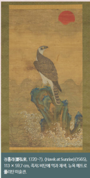 조선 후기 도화서 화원으로 활동했던 정홍래(鄭弘來, 1720~?)가 제작했을 것으로 추정되는 아침 해를 맞이하는 매(Hawk at Sunrise)에는 거친 파도에 아랑곳하지 않고 붉게 타오르는 아침 해를 의연하게 바라보는 매 한 마리가 보인다. 차가운 공기가 코끝을 스치는 1월이다. 한 해의 시작과 끝은 인간이 만든 시간의 인위적 경계일지도 모른다. 그래도 새해를 맞이하며, 우리는 무엇인가 새롭게 출발해야 하는 것 아닌가 하는 강박에 시달릴 수도 있다. 창문 밖으로 보이는 풍경은 여느 때와 다름없지만, 달력의 첫 장을 넘기는 우리 마음속에는 설렘과 막연한 두려움이 교차하곤 한다. 해마다 반복되는 학기이지만, 우리가 만나는 아이들은 언제나 새로운 우주이며, 우리를 둘러싼 세상의 파도는 매년 다른 높이로 밀려오기 때문이다. 그럴 때, 오래된 회화 한 폭을 꺼내어 천천히 들여다보면 어떨까. 뉴욕 메트로폴리탄 미술관에는 Hawk at Sunrise라는 제목의 조선 회화 한 점이 걸려 있다. 우리말로 옮기면 아침 해를 맞이하는 매이다. 거친 바다와 파도 위, 기암괴석, 떠오르는 붉은 해, 그리고 바위 끝에 홀로 선 한 마리 매가 화면을 채운다. 메트는 이 작품을 조선 후기 도화서 화원 정홍래(鄭弘來, 1720~?) 추정작으로 소개한다. 정홍래는 도화서에서 활동하며 어진1과 기록화를 그렸고, 특히 매와 일출을 결합한 그림, 이른바 〈욱일취도(旭日鷲圖)〉 계열로 이름을 남겼다고 전해진다. 국립중앙박물관과 간송미술관에 역시 같은 구도의 작품들이 전하며, 새해마다 궁중에서 제작해 나누어 주던 세화2이다. 왕이 신하들에게 새해의 뜻을 전하기 위해 하사하던 그림, 새해의 첫인사를 대신하던 이미지가 바로 이런 매와 해의 조합이었다고 한다. 이 작품은 조선 왕실과 상류층의 공간을 장식하던 이미지가 먼 시간을 돌아 세계적인 미술관에 걸려 있는 경우다. 2026년 새해를 맞는 오늘, 우리는 이 그림을 다시 우리의 교실과 연구실로 불러와 새해를 시작하는 시점에 꺼내보도록 하자. 거친 파도가 넘실대는 기암괴석 위에 우뚝 선 매 이 그림을 아래에서 위로 천천히 훑어보면 장면이 단계적으로 펼쳐진다. 가장 아래에는 청록과 남색이 뒤섞인 거친 파도가 있다. 겹겹이 말려 올라가는 곡선과 흰 포말이 화면 하단의 리듬을 만들어가며, 파도의 솟음이 생동감 있게 전달된다. 한 줄 한 줄의 붓질은 비슷한 패턴을 반복하면서도 매 순간 조금씩 다른 듯하다. 끊임없이 몰려오지만, 결코 같은 모습이 아닌 파도를 바라본 경험이 연상된다. 그 위로는 대각선 방향으로 치솟은 괴석이 자리한다. 바위의 기울어진 형태는 화면에 대각선을 만들며, 밑에서는 파도가 바위를 끊임없이 때리며, 윗부분은 하늘과 해를 향해 비스듬히 치솟았다. 자세히 살펴보면, 청록과 갈색이 교차하는 바위의 표면은 거칠고 불규칙하다. 하단의 기저선이자 수평선, 왼쪽으로 기울어진 바위, 오른쪽 위의 둥근 해가 변화를 주면서도 균형되게 우리의 시선을 유도한다. 바위는 단단해 보이지만, 자세히 보면 금이 가고 패인 자국이 가득하다. 오랜 시간 파도와 바람을 견디며 깎여 나간 자리, 우리가 서 있는 학교와 교실이라는 교육 공간을 닮은 듯하다. 바위 끝에는 한 마리 매가 서 있다. 갈색·회색·흰색이 섞인 깃털은 매우 정교한 필선으로 묘사되었으며, 검은 발톱과 날카로운 부리와 동그란 눈이 또렷이 살아 있다. 앞으로 약간 기울어진 몸, 정교하게 묘사된 깃털이 긴장된 자세를 드러낸다. 작가의 선묘와 채색이 가장 밀도 높게 모인 곳이 바로 이 매의 몸이다. 정홍래의 매 그림이 화려한 색채와 장식적인 세부 묘사로 유명하다는 설명과 정확히 맞물린다. 화면 전체의 리듬감 있으면서 거친 바다 배경이라면, 중심에 위치한 매는 의연하게 존재감을 드러낸다. 무엇을 바라보고 서 있을 것인가 화면 왼쪽 상단에는 붉은 해가 떠오르고 있다. 일출을 본 경험이 있다면, 그 긴박감 있는 순간이 연상되리라. 기다리는 내내 느린 듯하다가, 어느 순간 훌쩍 하늘 위로 두둥 떠오른다. 주변의 하늘은 구름과 넓은 여백으로 처리되어, 복잡한 파도와 대비를 이루며 해를 더욱 선명하게 떠오르게 한다. 붉은 해와 청록색 바위, 푸른 바다의 강한 색채 대비, 아래의 복잡함과 위의 여백이라는 공간 대비가 새벽의 서늘한 공기를 느끼게 낸다. 이 도상에는 미술사적 내러티브가 겹쳐져 있다. 조선 중기의 매 그림이 줄에 묶인 사냥매, 곧 ‘가응도’ 중심이었다면, 조선 후기에는 줄을 벗어 던진 야생의 매가 해·파도·바위와 함께 등장한다. 국립중앙박물관 〈욱일취도〉와 같은 작품이 그 사례이다. 바위 끝에 선 매는 정교한 선으로 그려진 깃털과 미세하게 갈라진 색채의 그러데이션으로 처리되며, 꼿꼿한 자세의 몸으로 존재감을 드러낸다. 날카로운 부리와 발톱, 앞으로 조금 기울어진 몸이 긴장감을 드러내기도 한다. ‘매’를 가리키는 한자 웅응(雄鷹)의 발음을 거꾸로 읽으면 영웅(英雄)이 된다는 설명처럼 바위 위에 홀로 선 한 마리 매는 영웅독립(英雄獨立)이라고 읽히기도 한다는 해석도 있다. 새해마다 궁중에서 제작해 신하에게 나누어주던 세화였다는 점을 고려