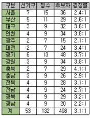 오는 31일 실시되는 제5대 경기도 교육위원 선거의 평균 경쟁률이 3.7대 1로 나타났다. 이는 지난 2002년 7월 실시된 제4대 도 교육위원 선거당시 경쟁률 3.2대 1보다 다소 높아진 것이다. 21일 경기도 선거관리위원회가 6개 선거구에서 모두 13명의 교육위원을 선출하는 '제5대 경기도 교육위원 선거' 후보등록을 마감한 결과 모두 48명이 등록해 평균 3.7대 1의 경쟁률을 기록했다. 선거구별 경쟁률을 보면 2명을 뽑는 제1선거구(수원.오산.평택.화성.안성)에 9명의 후보가 등록해 4.5대 1, 제2선거구(부천.광명.시흥)에 6명이 등록해 3.0대 1, 제3선거구(안산.안양.과천.군포.의왕)에 6명이 등록해 3.0대 1, 제4선거구(성남.하남.이천.광주.용인.여주)에 11명이 등록해 5.5대 1, 제5선거구(김포.고양.파주)에 6명이 등록해 3.0대 1을 나타냈다. 또 3명을 선출하는 제6선거구(의정부.동두천.구리.남양주.양주.가평.양평.연천.포천)에 10명이 후보등록을 마쳐 3.3대 1의 경쟁률을 보였다. 경기도교육위원 선거는 도내 44개 시.군.구별로 1곳씩 설치된 투표소에서 교원.학부모.지역인사로 구성된 학교운영위원 2만3천여명이 선거인단으로 참여한 가운데 오는 31일 오전 6시부터 오후 6시까지 실시된다. 선거구별 후보자 명단은 다음과 같다. ◇제1선거구 ▲조현무(趙懸武.62.현 수원시교육장) ▲이선직(李先稙.72.현 교육위원) ▲이학재(李學宰.64.용인대 교육대학원 강사) ▲정홍만(鄭弘滿.63.전 안성시교육장) ▲김명자(金明子.62.여.전 평택시교육장)▲정용택(鄭龍澤.52.천천중 교사) ▲김호영(金鎬永.63.청호농원 대표) ▲강관희(姜寬熙.51.경문대 교수) ▲김강영(金康泳.61.전 도의원) ◇제2선거구 ▲한상국(韓相國.61.현 교육위원) ▲이병도(李柄濤.45.태양렌터카 대표) ▲한만용(韓萬龍.54.시흥 대야초교 교사)▲임승길(林承吉.64.신흥대 강사) ▲최운용(崔云鎔.62.전 부천시교육장) ▲박오규(朴五奎.62.삼오유치원 운영) ◇제3선거구 ▲이철두(李喆斗.59.현 교육위원)▲이무길(李茂吉.62.전 안양시교육장) ▲김낙준(金洛俊.55.초등교 교사) ▲채규근(蔡奎根.45.성안중 교사) ▲이춘화(李春花.49.여.안산시청소년지원센터소장) ▲유옥희(柳玉姬.62.여.전 안산시교육장) ◇제4선거구 ▲전영수(全永壽.67.현 교육위원) ▲강창희(姜昌熙.71.현 교육위원) ▲홍정숙(洪貞淑.62.여.현 성남시교육장)▲유학영(柳鶴永.64.경기대 교수) ▲최의석(崔義錫.63.여주대 강사) ▲여대식(余大植.43.대한철도 대표) ▲김광진(金廣鎭.62.장안초교 교장) ▲김원근(金元根.46.송림고 교사)▲이무순(李武順.62.여.매송중 교장) ▲이화영(李華榮.44.여.풍양신문 편집인) ▲안영길(安英吉.44.성결대 교수) ◇제5선거구 ▲정헌모(鄭憲模.62.현 파주시교육장) ▲김성기(金聖基.58.현 지산초 교장) ▲최창의(崔昌儀.44.현 교육위원) ▲김장중(金章中.48.경영컨설턴트 대표) ▲허형(허형.62.현 백마고 교장) ▲노복만(盧福萬.48.사업) ◇제6선거구 ▲김태훈(金泰勳.69.현 교육위원) ▲이재삼(李在三.46.현 교육위원) ▲김용(金勇.64.현 교육위원)▲김윤식(金允植.63.전 의정부시교육장) ▲조돈창(趙敦昌.60.연천군교육장) ▲이영현(李英顯.62.전 청룡초 교장) ▲박원용(朴元龍.65.전 연천군교육장) ▲홍남용(洪南用.67.전 의정부시장) ▲성기종(成基宗.70.민주평화통일 자문위원) ▲박찬혜(朴贊兮.69.여.전 동두천고 교장)