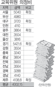 교육위원들의 의정비가 지역에 따라 심한 편차를 보이는 것으로 나타났다. 가장 많은 지역과 적은 지역의 차이는 2181만원을 넘어설 것으로 파악됐다. 교육위원 의정비가 가장 많은 지역은 경기도로 경기도의회는 최근 열린 본회의에서 5421만6000원을 지급하는 안을 통과시켰다. 가장 적은 지역은 충북으로 충북도교위 의정비심의위원회는 3240만원으로 확정했다. 충북교위는 9월중에 열릴 전체 교육위원회에서 최종안을 확정 도의회에 넘길 계획이지만 도의원 의정비가 3996만원인 점을 감안하면 늘어날 가능성이 거의 없다. 고규강 충북도교위 의장을 비롯 상당수 교육위원들이 심의위의 결정에도 불구하고 명예직 보수를 받기로 한 기존의 결의를 지키겠다는 입장이어서 오히려 줄어들 가능성도 적지 않다. 고 의장은 “전체 교육위의 조례제정시 현재와 같은 연 2640만원으로 의결해 도의회로 넘길 계획”이라고 밝혔다. 이렇게 될 경우 경기와 충북간의 격차는 2781만6000천원으로 충북교육위원은 경기교육위원의 반(48.7%)에도 못 미치는 수준의 의정비를 받게 된다. 당초 시의원 의정비와 같은 6804만원을 교육위원 의정비로 책정하는 안을 시의회에 넘겼던 서울시는 5040만원으로 최종 확정됐다. 시의회가 교육위원 의정활동일수 등을 들어 1764만원을 삭감했다. 13일 현재까지 시도의회를 통과해 교육위원 의정비가 최종 확정된 지역은 경기도, 서울시를 비롯해 광주와 제주 등 4곳. 광주는 3864만원으로 책정됐고, 특별자치도가 된 제주의 경우 교육의원 의정비는 도의원들과 같은 수준인 4138만8000원으로 확정됐다. 그 외 지역은 교육위원회 산하 의정비심의의원회가 교육위의 의정실적, 재정자립도, 예산규모, 타 시․도의정비 지급수준 등을 고려해 책정한 의정비를 전체 교육위의 통과를 거쳐 시․도 의회에 넘겨놓은 상태다.