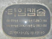 한 시대를 대표할 수 있는 각종 물건들을 특수용기에 담아 땅속에 보관, 일정기간이 지난 후에 발굴하도록 하는 인류 문화유산 보존방법의 하나인 타임캡슐을 우리학교 교정에도 묻었답니다. 1996년 5월 3일 우리학교 개교 40주년을 맞이하여 매설한 이 타임캡슐에는 학교를 상징할 수 있는 교복을 비롯, 학교의 역사를 기록한 학교신문, 교지, 아이들이 쓰던 학용품, 교과서, 각종 사진 등의 물품을 선정하여 매장했는데 앞으로 개교 100주년이 되는 해인 2056년 5월 3일에 개봉하기로 되어있습니다. 비록 지금 있는 사람 중엔 타임캡슐을 개봉할 때 참석할 수 있는 사람은 거의 없겠지만 우리 후손들이 이 타임캡슐을 통해 한 시대를 살다간 우리 조상들의 흔적을 보고 배울 것이 있었으면 하는 소망입니다.
