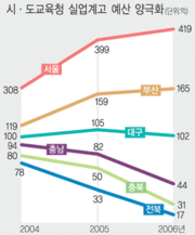 참여정부 들어 실업계 고교에 대한 정부의 예산 지원이 대폭 감소하고 있고, 재정자립도가 높은 시도와 그렇지 못한 시도간의 실업계 교육여건 격차가 더욱 심화되는 것으로 조사됐다. 이는 실업고 교육 정상화를 통해 교육양극화를 해소한다는 열린우리당의 정책방향과 정면 배치되는 현상이다. 교육부가 최근 집계한 바에 따르면 2004년도 16개 시도교육청 실업고 예산은 모두 1807억 1500만원이었지만 ▲2005년도는 전년도 91% 수준인 1643억 6800만원 ▲2006년도는 82% 인 1480억 8100만원인 것으로 드러났다. 재정자립도가 낮은 시도는 예산이 더욱 줄어 ▲전북의 경우 2005년도 실업고 예산은 32억 6400만원으로 2004년도(78억 1500만원)의 42%, 올해는 17억 2600만원으로 2004년도 22% 수준에 그쳤다. 충북도 상황은 비슷해 2005년도는 49억 6300만원으로 2004년(79억 7300만원) 대비 62%, 올해는 31억 3700만원으로 2004년도의 39%만 확보했다. 16개 시․도 중 2005년도는 12개 시․도, 올해는 13개 시․도가 2004년보다 실업고 예산을 줄였다. 반면 부산은 올해 165억 9400만원을 확보해 2004년 대비 139%, 서울은 419억 6800만원으로 2004년 대비 136% 예산을 늘렸다. 대구는 올해 102억 1200만원으로 2004년(100억 5600만원)을 약간 웃돌았다. 교육부는 “올해 시도별 추경을 통해 예산이 늘어날 여지는 있다”고 밝혔다. 전반적으로 실업고 예산이 감소하는 것은 2005년부터 중앙정부의 예산지원이 폐지돼 시도별 예산으로만 책정되기 때문이다. 정부혁신지방분권위원회는 2004년 7월 국고보조금 정비방안을 통해 이 같은 조치를 확정했다. 교육부가 1996년 신직업교육체제 구축방안을 통해 직업교육의 중심축을 중등 이후 단계로 이동시킨 것도 실업고 예산 감소 요인으로 분석된다. 1997년 중앙정부 차원의 실업고 예산은 1021억 원이었지만 매년 줄어 2003년에는 500억 원에 그쳤다. 시도별 예산 감축은 단위학교의 기자재 확충, 실험실습, 교원 연수 위축으로 이어져 실업고 교육 정상화에 걸림돌이 되고 있다. 김종관 교육부 과학실업교육정책과장은 “시도교육청이 지방채를 발행해서라도 예산을 확보해야 실업교육이 정상화 될 수 있을 것”이라고 밝혔다.