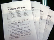 학년 초가 되면 이런저런 일로 조사하여 제출할 것이 많습니다. 학급이나 학교 운영에 필수적인 자료들은 대부분 이맘때쯤 확보하게 되지요. 아침부터 바쁘게 움직이던 중, 책상 위에 놓인 유인물을 발견하게 되었습니다. 바로 학부모들을 대상으로 한 설문지였습니다. 잠시 설문지의 내용을 살펴보니 충청남도 교육청에서 금년을 '학교 혁신의 해'로 정하고, 수업과 행정의 변화를 통하여 학교를 '행복한 배움터'로 만들겠다는 의도가 담겨 있었습니다. 몇 몇 아이들에게 설문지를 나눠주고 부모님의 의견을 받아오라고 했더니, 다음날 일제히 설문지를 가져왔습니다. 설문지를 보니 문항마다 학부모님들의 정성이 가득 담겨 있었습니다. 학부모님들의 의견 가운데는 교육 현실을 정확히 이해하고 바람직한 대안까지 제시한 경우도 있었습니다. 문제는 애써 설문만 받아놓고 정작 실천에 옮기지 않으면 무용지물이나 마찬가지라는 점에서 정책 담당자들의 의식 개혁도 함께 따라야 한다는 생각이들었습니다.
