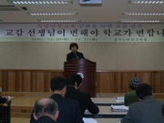 보라, 나는 내 일생을 즐거이 던진 곳이 있다. 거기는 내 교단 정든 제자들 모여 노는 곳. 오늘도 웃으며 노래하며 나는 내 길을 간다. 황금빛보다 더 빛나는 고난의 훈장 번쩍인다. 제2의 창조자. 가장 고귀한 이름 띠고 저기저 해, 달과 더불어 내 길을 간다. - 이은상 시 - 경기도안산교육청(교육장 류옥희)이 주관한 중학교 교감 연수가 지난 12월 26일부터 1박 2일간 교육장, 학무국장, 중등교육과장, 중등 장학사 전원과 관내 중학교 교감 28명이 참가한 가운데 안성수덕원에서 열렸다. 3개 분과로 나누어진 분임토의에서는 올해 안산교육시책 반성, 내년도 안산교육 계획 검토, 경기교육 100대 발전과제 적용방안 등에 대하여 진지한 협의를 가졌다. 이어 원일중 서병숙 교감의 '효과적인 자율장학을 위한 교감의 역할' 우수 사례를 발표가 있었다. 류 교육장은 특강에서 "목표를 다시 확인하고 지금 이루어지는 일들이 우리가 진정 추구하는 것인지 점검해보자"며 "무엇을 변화시킬 것인지, 내가 버려야 할 것은 무엇인지 생각해보자"고 강조했다. 이튿날, 최길용 학무국장은 총평에서 '21세기 성공을 꿈꾸는 사람을 위한 새로운 성공 패턴', '행복한 삶을 위한 Happy 7' 등을 제시하며 "교감 책상에 적어도 전문서적 10여권 이상을 쌓아 놓고 시대 변화를 꿰뚫는 마인드를 갖자"고 하였다. 연수 기간 동안 김현옥 중등교육과장은 교감들과 시종일관 자리를 함께 하면서 "교감 역할은 지혜도 필요하지만 마음의 여유가 필요하다"며 "가장 인간적이어야 할 학교에서 교사들과 인간관계를 잘 맺어 행복한 학교를 만들자"고 말해 교감들의 공감을 얻었다. 연수에 참가한 교감들은 교육청에서 준비한 '교감 선생님이 변해야 학교가 변합니다', '교감 선생님이 계시기에 안산교육 든든합니다' 현수막을 보면서 매너리즘에서 벗어나 학교와 안산교육 발전을 위해 가일층 노력할 것을 다짐하며 연수를 마쳤다.