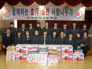 연말연시를 맞아 인천부개여자고등학교(교장 김한신)에서는 27일 효행봉사단(지도교사 이연숙, 김영순) 학생들과 교사들이 효행의 소중함을 실천하는 "효 실천 사랑나누기" 행사를 개최했다. 또한 지난 12월 21일에는 적십자사 인천지부와의 협조 속에 1,2학년 학생 중 132명이 사랑의 헌혈하기에 동참해 소중한 생명나누기를 실천하기도 했다. 개교 당시부터 학교 특색사업으로 "효 실천"을 꾸준히 실행하고 있는 부개여고는 이 날 부개 3동 관내의 홀로 사는 노인 중 본교 학생 45명과 결연한 11분의 홀로 사시는 어르신들에게 겨울철을 지내는데 가정에서 필요한 생필품을 나눠드리는 행사를 가졌다. 생필품에는 추운 겨울을 따뜻하게 보낼 수 있는 작은 정성이 담긴 선물로 라면 ,내의, 양말, 목도리, 장갑과 약간의 기념품을 전달했으며 행사가 있은 후 효행봉사단 45명의 학생들과 교사들이 홀로 사시는 어르신 가정을 방문하여 선물을 나누어드리고, 몸이 불편한 어르신들을 위해 청소 및 집안 정리정돈, 어깨 주물러드리기 어르신과 대회시간 등 위로활동을 펼쳤다. 특히 부개여고는 이러한 행사 외에도 경로잔치, 모란가족 대화장 쓰기 등을 통해 가족의 소중함과 서로 나누는 이웃 사랑을 실천하기 위해 노력하고 있다.