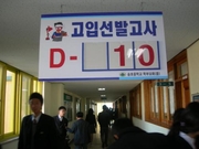 이제 고입 선발고사가 10일 남았다. 그러나 중학교 학생들의 학교 생활은 변함없이 밝고 명랑하기만 하다. 쉬는 시간 복도에서 학생들의 즐거운 재잘거림은 고입 카운트다운 표지판과 어울리지 않을 정도다. 경기도의 경우, 평준화 적용지역 5개학군(수원권.성남권.안양권.부천권.고양권) 가운데 수원.부천.고양 등 3개 학군 지원자가 정원에 미달된 것으로 나타났는데 도내 5개 평준화 적용지역은 5만2천435명 모집에 5만2천72명이 응시, 평균 0.99대 1의 경쟁률을 기록한 것으로 나타났다. 모집정원 9660명인 성남권에 9831명, 모집정원 1만605명 안양권에 1만752명이 지원, 각각 171명과 147명이 탈락하게 됐다. 그러나 나머지 3개 학군 가운데 수원권(모집정원 1만2060명)은 110명, 부천권(1만150명) 70명, 고양권(9960명) 501명이 정원에 미달한 것이다. 이와함께 167개교가 4만8771명을 모집하는 도내 평준화 비적용지역에도 정원보다 597명이 부족한 4만8174명이 지원, 평균 0.98대 1의 경쟁률을 나타냈다. 평준화 비적용지역의 64개 고교 지원자가 정원을 채우지 못한 것이다. 지난해 경기도내에서는 평준화 적용지역의 경우 성남권을 제외한 4개 학군의 지원자가 정원에 미달된 가운데 평균 0.99대 1의 경쟁률을 보였으며 평준화 비적용지역에서는 78개교가 미달된 가운데 평균 0.96대 1의 경쟁률을 기록했다.